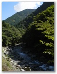 浅瀬橋から1時間ほど歩いた頃、法行橋にやって来ました。浅瀬橋と地蔵平とのほぼ中間点です。橋の上から見る法行沢の水は美しい色に光り、上流には緑の茂みを透かして小さな滝が見えました。橋を渡りきると、「世附川流域を保全する治山事業」の看板がありました。「一旦、小規模崩壊が発生すると更に拡大する恐れがあるため、早急に緑化を図るため…」と書かれています。