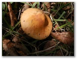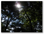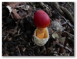 尾根の左(北)寄りを歩くと、わずかながら谷風が涼しさを運び上げて来ました。時折雲の切れ目から日が差し、広葉樹の葉をステンドグラスのように輝かせます。尾根上に横たわっていた、通せんぼみたいな倒木に腰を下ろし、糖分と水分を補給しました。真っ赤なタマゴタケが、みずみずしいトマトのように見えたほど、のどが渇いていました。