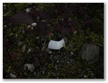 広場には、紫色のシソ(紫蘇)が生い茂っていました。最近誰かが腰を下ろしたらしい丸木と、焚き火の跡があります。その近くで茶碗のかけらを見つけましたが、これはいつのものでしょうか? 地蔵平は廃村になって、更地に戻されたのでしょうか? 四季折々には、庭木や宿根草の一輪でも咲いていそうなものを。もしや、土石流に埋まったのでしょうか?しかし、地蔵平から生活の痕跡が消えても、人の心が切れていないことは、お地蔵様が証言しています。