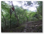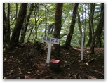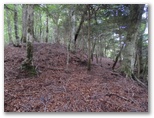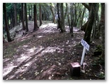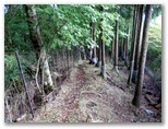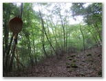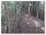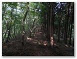 林道跡を進むと、尾根を巻くところに、今は遺物となったカーブミラーが立っていました。そしてさらに3分ほど先に、ガラスが完全に落ちてしまったカーブミラーがあり、その10mほど手前から右の斜面に踏み跡がありました。踏み跡だと思って見れば、かなりまともな踏み跡に見えます。これを辿って登って行くと、2~3分で尾根に楽々乗ることができました。あとは、山頂までひたすら尾根すじを辿るだけです。
