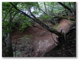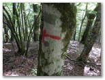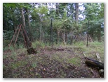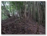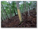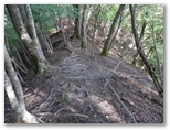 きょうの目的は一応果たしました。私は丸太に腰を下ろし、一口お茶を飲むと、それまで履いていたスニーカーを脱いで、トレッキングシューズに履き替えました。山を越えて帰るためです。まず、広場から立ち上がる尾根(屏風岩山西尾根?)に取りついてみました。しかし、強烈な獣の臭いを感じ、私は本能的に身を引きました。おそらく鹿の臭いだったのでしょうが、断定はできません。