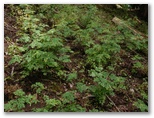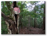 下山は、東に進むことを基本とします。まずは、赤ペンキで大きな×印のある尾根を下り、東峰(約1050m)に登り返します。このあたり、鹿柵、食害から幹を守る網、マツカゼソウの群落など、シカに因むものが見られました。東峰から振り返ると、屏風岩山の頂が見えます。尾根の分岐点である965m地点には、「火気に注意」と書かれた円い標識がありました。大滝橋へは左の尾根を下ります。ヤマレコでは、何故かこの965m地点を東峰としています。