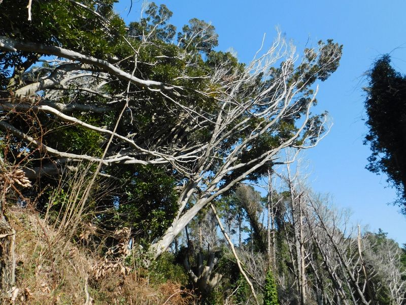 -- 烏場山頂まで3分。斜め立ちの木が多い。