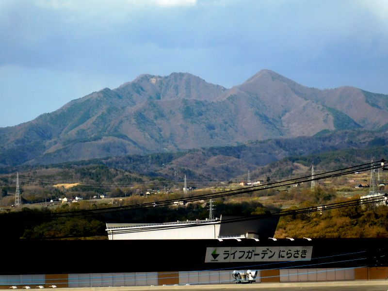 -- 韮崎駅ホームより、茅ヶ岳(右)と金ヶ岳。15:54