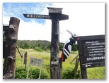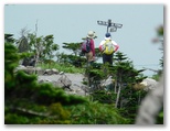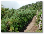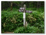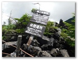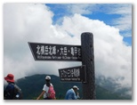 南峰で3分ほど休憩しました。眺望をあきらめ、北峰に向かいます。途中、ハイマツの廊下のような道があり、腕を擦るハイマツの優しい感触が心地よく感じました。南峰から4分ほどで北峰に到着。相変わらずガスで、遠望は利きません。せめて蓼科山だけでも見たかったのですが、大河原峠と双子山が辛うじて見えただけでした。ここでお昼にします。腰を下ろし、南八ヶ岳、南アルプス、蓼科山などを想像していると、山頂から明るい声が聞こえました --「また来よう!」
