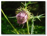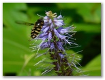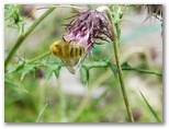 2分ほどで七ツ池に到着。池は静寂そのもので、誰もいませんでした。大きなヤンマが池の上をゆっくりと飛んでいます。池に映る空が青かったらいいのにと、つくづく思いました。なお、現在ここで見ることのできる池は二つだけです。ヒュッテに戻ると、アザミに訪花していた蝶とハナバチを見つけ、少しねぎらわれた思いがしました。登山を続行します。ヒュッテから10分ほどで、北横岳南峰に到着。多くの先客が休んでいます。残念ながら、山頂はガス(雲)の中でした。