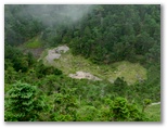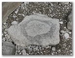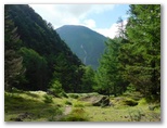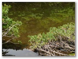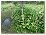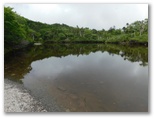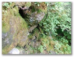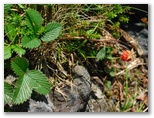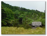 下り道の途中で、張り出していた岩に頭をぶつけてしまいました。私は夏山用に、つばの大きな帽子を冠っていたのですが、このつばが上方の視界を狭くして、でっぱり岩に気が付かなかったのでした。ゴツンした瞬間はとても痛かったのですが、幸い数分内に痛みは治まりました。急ぐ道ではないし、万一の場合にも人通りがないので、慎重に下っていきます。予定よりも30分ほど超過し、亀甲池に到着しました。ひっそりとした森の小さな池です。水は多くありません。