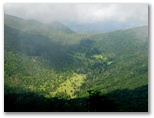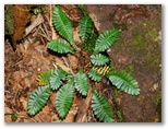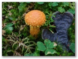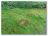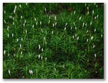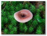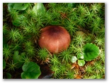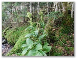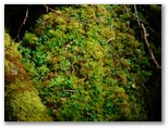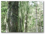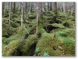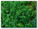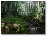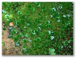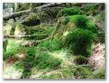 午後1時15分、下山開始。まず亀甲池に向かいます。下り始めてすぐ、山頂直下に深いくぼ地が見えました。後で地図を見て分かったのですが、これは北横岳の噴火口です。ネット情報で、北横岳が活火山だということも知りました。さて、道はかなりの急勾配です。登る人は骨が折れることでしょう。でも出会ったのは一人だけ。セミの声もない、静寂の山。いたる所を覆う緑の苔が、あらゆる音を吸収してしまうかのようです。林床に日が差すと、苔類が美しく輝きました。