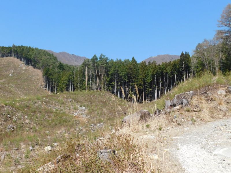-- 伐採地から望む、大沢山と小楢山(右)。