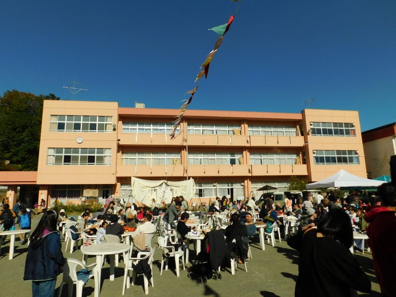 -- 校庭で「藤野まるまるマルシェ」開催中。12:16