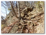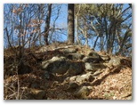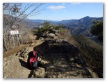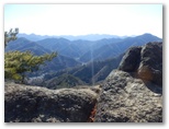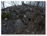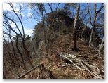 真っ白な富士の嶺を見たくて、正午まで粘りましたが、あきらめました。この御前山にも「秀麗富嶽十二景」の標識がありますが、秀麗の富士を見るには、朝なるべく早く来るべきでしょう。今回は、出遅れました。正午のメロディーが風に流れて来たのを機に、九鬼山に向かいます。尾根道を行くと、すぐに出合うのが八五郎岩。南側の八五郎クドレ(崩れの意?)をトラバースする道があります。通過後に八五郎岩を振り返ると、その西面の岩稜が難所だろうと思いました。