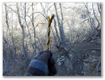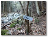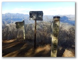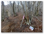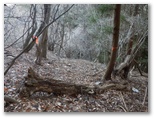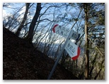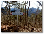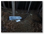 馬立山頂から5分ほど行くと、道標が左の尾根を指していました。直進の尾根道は、植野山経由、田野倉駅です。道標に従って左折すると、行く手に九鬼山がよく見えるようになりました。その稜線の木々を、1本、2本と数えられそうです。そして704m峰を越えて南下して行くと、立ち木に赤ペンキの矢印がありました。これに従い、下った鞍部が札金峠(さっかねとうげ)。古い方の道標に、札金鉱泉と朝日小沢の名があります。この道標には何故か、熊手が付いていました。