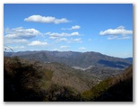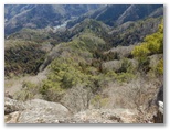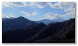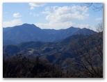 車道は上り坂になり、その脇の歩道をしばらく歩いて行きます。短いトンネルを抜けると、右手の展望が俄然よくなりました。百蔵山と扇山を撮影するなら、この坂道がお奨めです。この後、すぐに登山道入口に至りました。熊出没注意の標識があります。さっそく階段を登り、杉林を抜けると、明るい落葉樹林になりました。振り返ると、木の間越しに猿橋の町と、先ほど見た山々が望めます。これより先、九鬼山に至るまで、周辺の山々を眺めながら歩くことになります。