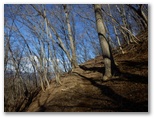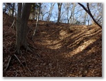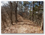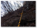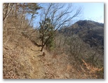 登り返しの途中で菊花山からの道を右から合わせると、すぐに沢井沢ノ頭でした。取り立てて何もなさそうなので、写真だけ撮って素通り。でも、その先の平坦な尾根道は、明るくのどかで、足が弾みました。標高740m+の小峰を越え、馬立山(またてやま:797m)の登りに入ります。長いトラロープが連続して現れますが、落ち葉の積もった季節の下りでは、とても有難いものでしょう。ロープに沿って登って行き、南面から折り返すようにして、馬立山頂に立ちました。