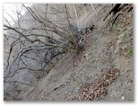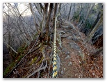 いよいよ、九鬼山の核心部に入ります。地理院地図では、九鬼山北尾根を直登する登山道が記されていますが、現在の道は東面を巻き、北東尾根に乗ってから、山頂に至るように付けられています。まず権現山稜の好展望地を経た後、急斜面のトラバースに入りました。ここにもしロープが全くなければ、鬼ヶ島を髣髴させる景観かもしれません。底知れぬ谷、樹木の乏しい斜面、狭いザレ道など。幸いこの日は、地表が低温で固まっていて、足をしっかりと支えてくれました。