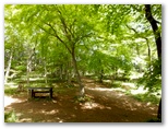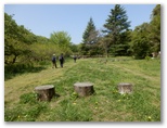 評議原に到着しました。モミジのまぶしい新緑が歓声を誘います。ここは、かつて武士たちが評議を行った場所とされています。私たちもベンチに腰を下ろし、お茶とお菓子を取り出して、談議に入りました。紅葉の季節は、今よりもまた美しくなるに違いありません。春は花見、秋は紅葉狩り。武士たちも「評議」にかこつけて、林間に酒を暖めたり(林間暖酒焼紅葉)したかもしれません。小松ハイキングコース中では、唯一と言ってもよい広場です。