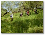 グループに女性がいるときは、トイレの場所を考えておかねばなりません。コンビニを探すのを忘れたので、川尻八幡宮のトイレを借りました。鳥居わきに立つ樹齢500年以上とされるウラジロカシの巨樹ほどではありませんが、かなり歴史のあるトイレだと思います。昭和レトロを喜べる方にはお奨め。次は、城山カタクリの里前の駐車場で、準備運動をしました。今年度はすでに閉園したので、車はありません。境川の支流沿い、谷戸風の里山風景を、皆さん喜んでいます。