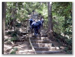 城山湖に向かいます。金比羅神社と航空神社はパス。ダム入口の門から入りますが、門限があります。すぐに、本沢(ほんざわ)ダムが見えてきました。今、斜面の緑がとてもきれいです。城山湖を背景に記念撮影。開放感を楽しみながら、堤頂を歩いて余水吐まで行くと、大きなコイが数匹泳いでいました。ここから眺める城山湖は、光の演出が楽しみです。階段を上り「はなさき休憩所」で小休止。次は正念場の百階段へ。瞬発力はなくても、鈍発力(?)で突破できます。