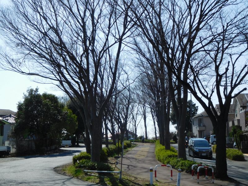 -- ④ 尾根緑道のケヤキ並木に進む。9:56