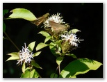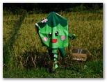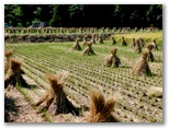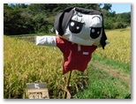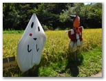 2020年9月28日(月) ◆秋口の長雨を「薄梅雨(すすきつゆ)」と言うそうだ。きょう、その薄梅雨がようやく明け、爽やかな秋晴れを楽しむ日々が始まった。さっそく向かったのは、萱葺きの古民家がすてきな舞岡公園。◆コロナ制限により、残念ながらその古民家には入れない。前庭の木陰に腰を下ろし、古民家を眺めつつティータイムにした。隣に座った元公園ボランティアだという年配の男性は、毎月1~2度ここに来ているという。私たちは雑談しながら、ひと時ノスタルジアに浸った。(歳だなあ)◆納屋のわきに、ツルニンジン(ジイソブ)が花をつけていた。主屋の裏手に回ると、水を張ったプランターがミニビオトープになっていて、ミズオオバコやコケオトギリなどの花が見られた。また向かって右の物置の裏には、ナンバンギセルが咲いていた。◆帰りは前田の丘まで尾根道を歩いた。適度な登り下りがあり、運動にはよいが、半袖姿だったので、蚊に刺されまくった。他の季節はどうなのか知らないが、花や虫を訪ねるには、下の田んぼ沿いの道がいいと思う。◆今回は、案山子まつりも楽しめた。それぞれの案山子に付けられた名前も面白い。防鳥効果のほどは疑問だが、案山子の評価とは無関係だろう。