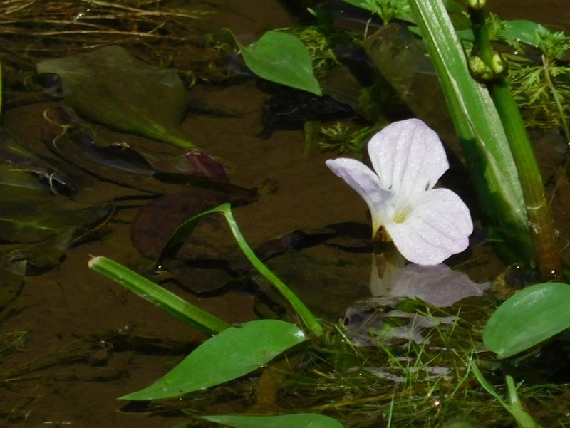 -- ミズオオバコの葉(紫色)は、水に浸かっている。
