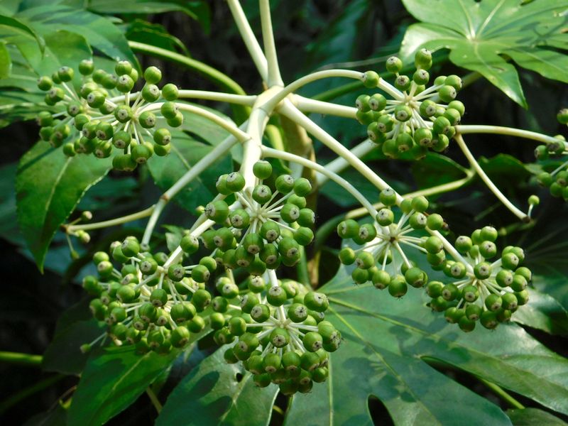 -- ヤツデの実がたわわ。