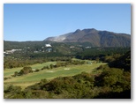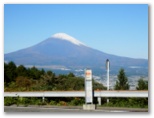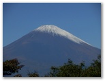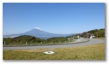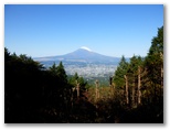 緩やかなアップダウンを越えて行くと、行く手の小峰(1063m)の中腹に緑地が見えてきました。休憩と食事に好さそうです。果たしてそこは「富士見ヶ丘公園」で、その名の通り、富士山とその広大な裾野をストレートに望める空間でした。来た道を振り返ると、電波塔の立つ丸岳、力こぶのような金時山、遠く丹沢の峰々、その右端の大山まで、きれいに望めました。さっそく草の上に腰を下ろして大休止とします。あの富士山は、帽子の冠り方がちょっと小粋かな。
