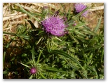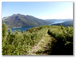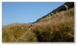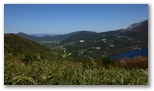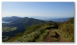 その公園から7分ほど先の1018m峰で、ハイキングコースは左折し、湖尻峠への下り道になります。道標に「湖尻峠15分」とあります。でも、ここは芦ノ湖を正面に見るすばらしい展望の道。今まで見られなかったマツムシソウや、色々の花も咲いていて、私は30分以上を要しました。私がカメラの電池を交換していると、二人のランナーが、この真っ直ぐな草原の道を駆け下りて行きました。さぞ、気持ちよかったことでしょう。今の私は、全く走る気になりませんが。