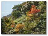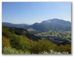 乙女峠に着いたら、すぐに丸岳に向かわないで、少しだけ金時山方向に行きましょう。すばらしい展望の休憩所があります。特に、威厳ある神山の姿と、白煙を上げる大涌谷とを眺めるのに絶好の位置です。手前の山は台ヶ岳。山裾にススキ草原とその遊歩道とが見えます。きょうのゴールは、あのススキ草原。楽しみです。山々はまだ濃い緑ですが、その表面に紅い色が表れ始めています。山の空気は爽やか。汗をかく前にベストを脱ぎ、リュックの中にしまいました。