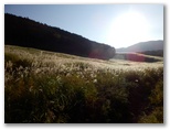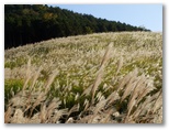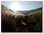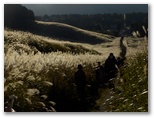 早川と別れる地点よりススキ草原に至るまでの道が分かるかな、と心配しましたが、要所要所に立つ道標のおかげで、難なく行けました。最後に県道を渡り、ススキ草原の入口に行くと、すごい人出。さすが有名観光地です。土休日にはどれほどの人が押し寄せるでしょうか。人ごみを早く抜け出そうと、遊歩道を急ぎます。高級カメラを手にした人々。ウェディングドレスの女性。和服姿の女性。撮影する男性。飛び交う中国語、韓国語、英語、日本語、等々。