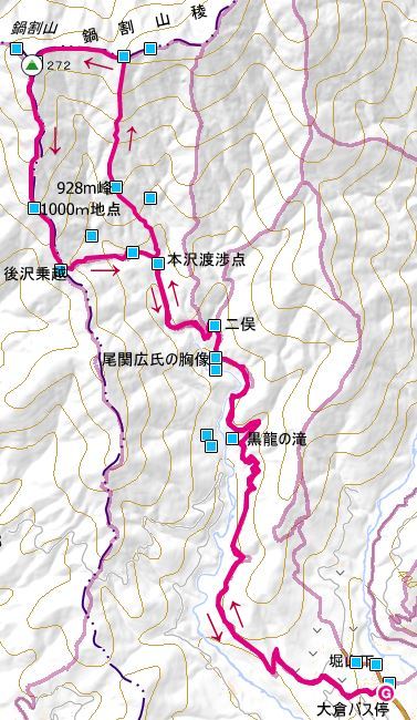 地理院地図: マルガヤ尾根928m峰 , 歩行ルート図