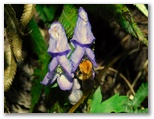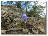 928m峰を後にして軽く下ると、尾根がやや狭まりました。登り返した先でアセビのトンネルを抜けます。進むにつれ、尾根が岩稜の様相を帯びてきました。ベル型の小さな青紫の花は、イワシャジン。岩の隙間に根を張って生きます。標高950mあたりから一層狭くなった尾根を、廊下を渡るように通過しますが、長くはありません。この頃、とても大きな雲が太陽光を遮り、せっかくの紅葉も光彩が半減しました。太陽の現れるのを待ち望みつつ、前に進みます。