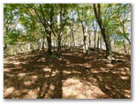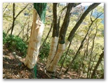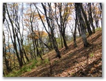 踏み跡は、ずっと続いていました。おかげで省エネモードで登れます。25分ほど登ると、カシノナガキクイムシの被害樹が数本ありました。「かしながホイホイ」という捕虫紙が巻かれています。ここにそれを書く理由は、大倉からここまでが頑張りの道、ここから先が喜びの道だったからです。「おつかれ様、さあ明るい広葉樹の別世界へどうぞ!」とは想像の山の声。木々の葉は、潤いの緑から鮮やかな朱色まで取り揃え、山の住人(樹木)総出で芸術祭の真っ最中です。