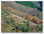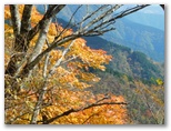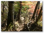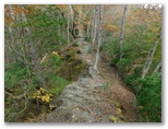 十分に満たされた心で、下山の途に就きました。鍋割山南尾根を、二俣へと下ります。この道は何度も歩きましたが、地図上のコースタイムで歩けたことがありません。原因は、疲労、泥濘、慎重な心、バスへの時間調整、等々です。ところが今回歩くと、とても歩きやすい道になっていました。美しい紅葉と左右の展望にも恵まれ、後沢乗越への下り道が短くなったような気がしたほどです。二俣への道もスムーズでした。梯子には頑丈そうな手すりも付けられていました。