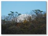 鍋割山頂でも、すばらしい富士山を望めました。時刻は11時30分。富士山を見ながら休憩中の人、お弁当の人、うどんをすする人などいます。私の昼食は、リュックを軽くするために、菓子パンと熱いミルク紅茶とみかんが、秋冬の定番です。久しぶりに見る鍋割山荘には、ソーラーパネルが増え、きれいな「山岳公衆トイレ」ができていました。コロナ禍の現在、山荘は立入禁止で、うどん待ちの人は外に並びます。暖かな日差しと、穏やかな空気に包まれた山頂でした。