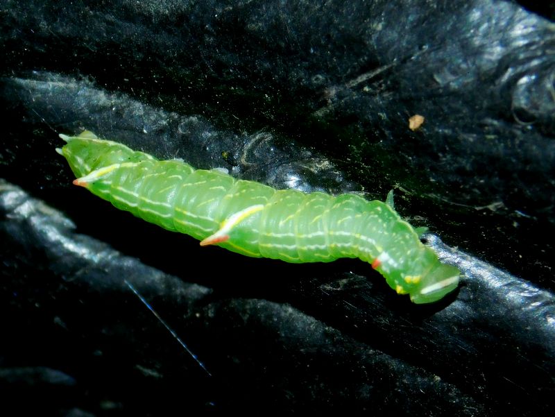 -- カバイロモクメシャチホコの幼虫:右が頭。