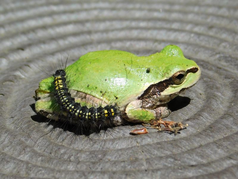 -- ニホンアマガエルとキアシドクガの幼虫。