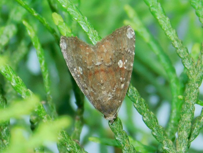 -- サビイロコヤガ:緑の葉はカイヅカイブキ。