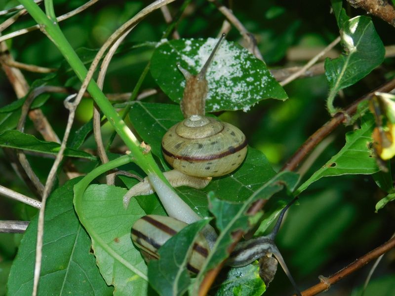 -- ヒダリマキマイマイ(上)とミスジマイマイ(下)。