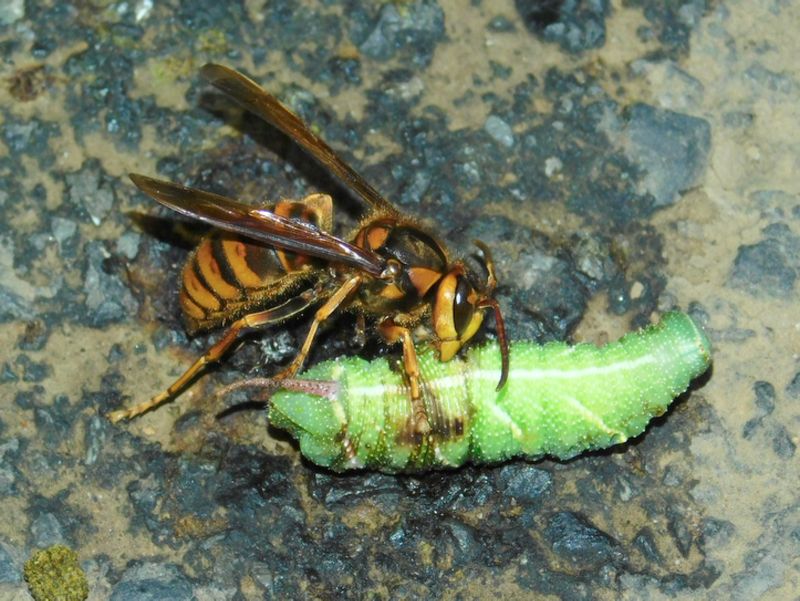-- キイロスズメバチが、スズメガの幼虫を狩る。5:04