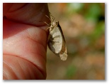 2023年1月25日(水) ◆今朝は10年に一度の寒波襲来だとか。でも日中は穏やかに晴れた。午後は消防設備点検が予定されていたので、短い空き時間での探索となった。◆三保平の木の幹で、小さな蛾が風に吹かれていた。翅がうす紙のように柔らかいようで、飛べない。翅の表が一瞬見えて、ホソバフユシャクと判明した。◆谷道でシモフリトゲエダシャク♀を見つけた。一目でそうと判る大きなメスだ。これが今日の一押し。◆三保平のトイレは清掃中だった。清掃後に行ったら、何もいなかった。◆クサカゲロウ2種。名前が間違っていたら、ご教示願います。