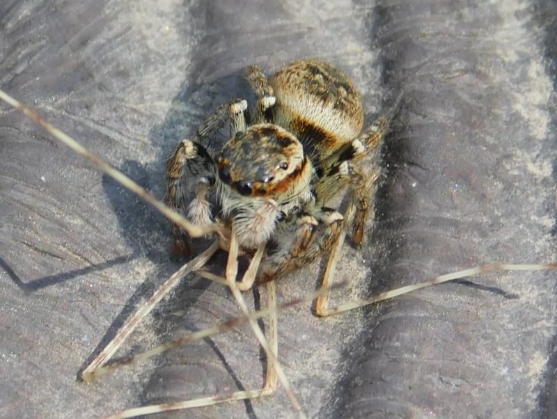 -- ナナフシモドキの幼虫を捕らえたネコハエトリ。