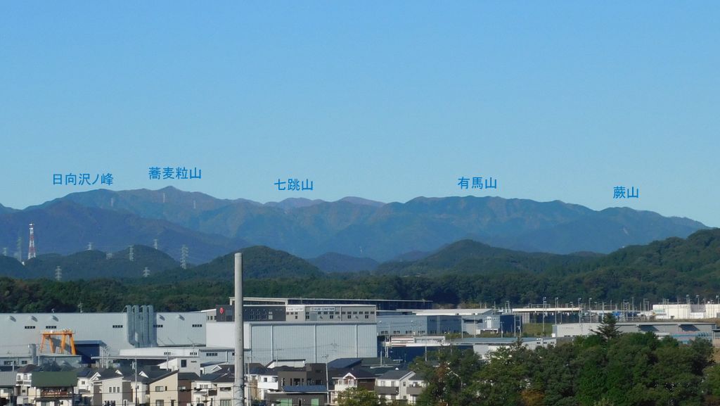 -- あさひ山展望公園より望む、日向沢ノ峰〜有馬山〜蕨山。