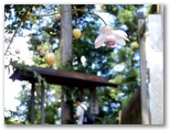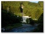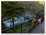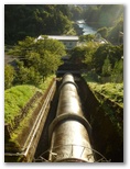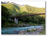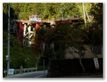 さて、御岳山表参道へは、なるべく車道歩きを少なくするため、神路橋(かみじばし)を渡って多摩川右岸に行くつもりでしたが、間違えて杣の小橋(そまのこばし)を渡ってしまいました。ところが、その右岸にも遊歩道らしい道があったので行ってみると、発電所の横の石段を昇ったところで行き止まり! しかたなく、赤い大鳥居までは吉野街道を歩くことにしました。御嶽駅から最も近い吊り橋が「杣の小橋」で、2番目の吊橋が「神路橋」です。次回は間違えません。