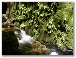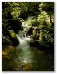 御岳山頂には、涼しい谷風の通り道がありました。これは幸い、しばらく涼んで行きましょう。こうして霊気と冷気で十分に英気を養ってから、「わんこと一緒にトライアルコース」を歩いて、御岳沢に行きました。ロックガーデンのある沢です。沢沿いに遊歩道を登り、適当な岩を見つけて腰を下ろしました。さっそく裸足になって、沢の水で足を冷やします。火照った足がみるみる冷えて、とてもいい気持ち。でも水があまりに冷たくて、1分が我慢の限界でした。