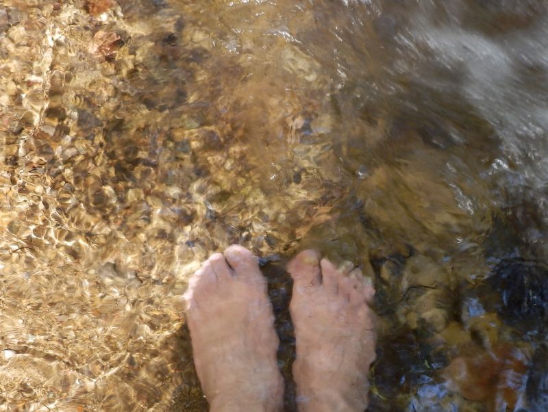 -- 御岳沢で足を冷やす。水が冷たく、1分が我慢の限界。11:55