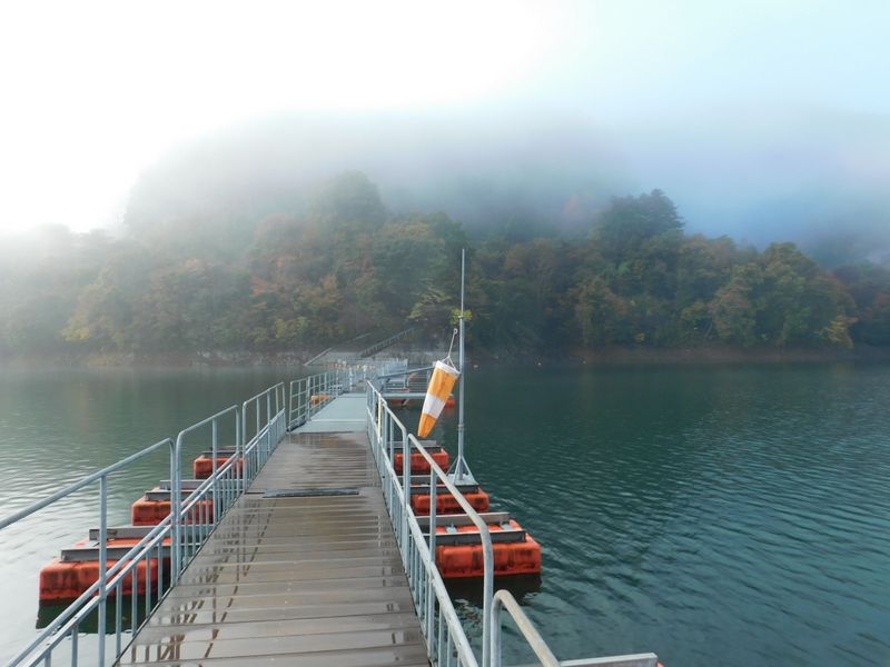 -- 無風の奥多摩湖。霧も動かない。8:02