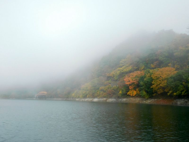-- 浮橋より、奥多摩湖上流北岸を望む。8:03