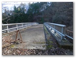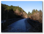 登り切ると、右手に10号橋が見えました。ところがその尾根は、高い擁壁でぷっつりと切断! 右か左に降りなくてはなりません。検分した結果、左側にほどよく立ち木が配置されていたので、ほとんど困難なく下りることができました。下り立ったところは、一応村道のようです。右に10号橋がありました。きょうの最初の目的地です。