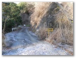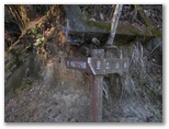 7号橋を渡ると、立派な道標がありました。二つの腕木があり、土山峠と県道70号線を指しています。後者は山越えルートで、半島の向こう側で県道70号に接続しますが、その接続点はゲートで閉ざされています。村道が開通するためには、まだいくつかの橋を建設しなければならず、巨額の予算が必要でしょう。その日が来るまで、7号橋から清川トンネル北端までの区間をつなぐのは、山道しかありません。